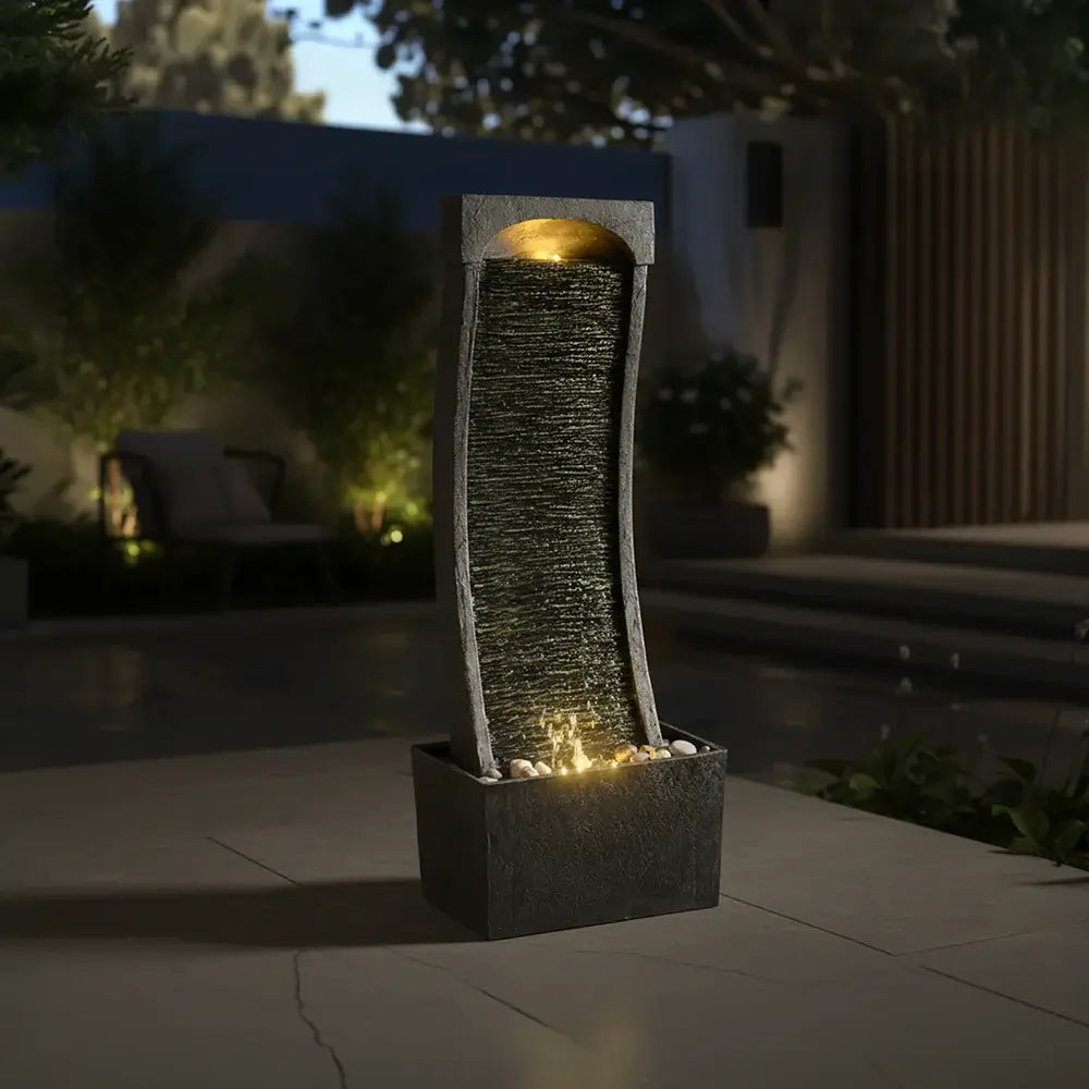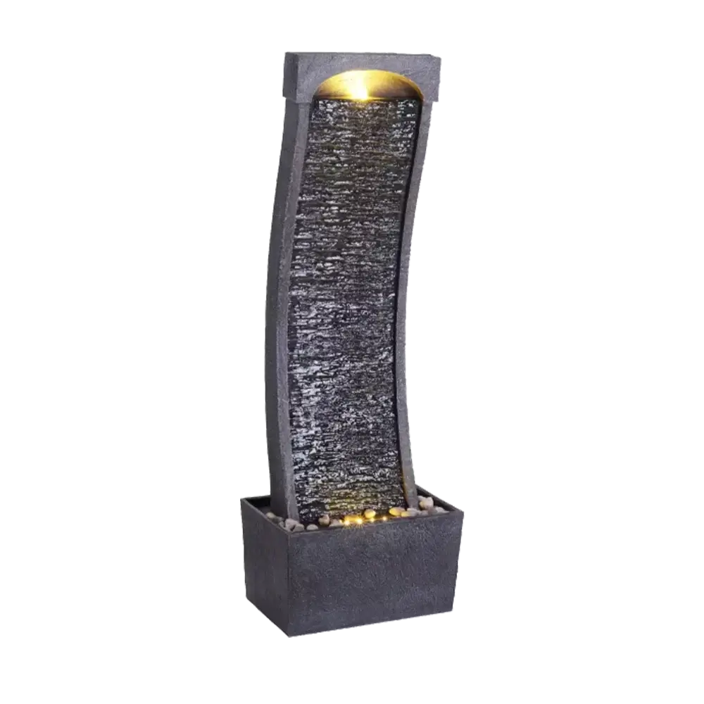 Our precisely engineered curved waterfall surface creates a smooth, continuous water flow that generates the authentic sounds of a natural stream. The curved design guides water in a gentle cascade down the textured stone surface.